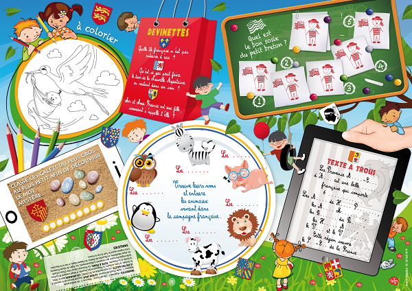Deux modèles de sets de table spécialement conçus pour les enfants. Un modèle avec des jeux exclusivement sur le thème de la Bretagne et un modèle avec des jeux sur une thématique plus large.